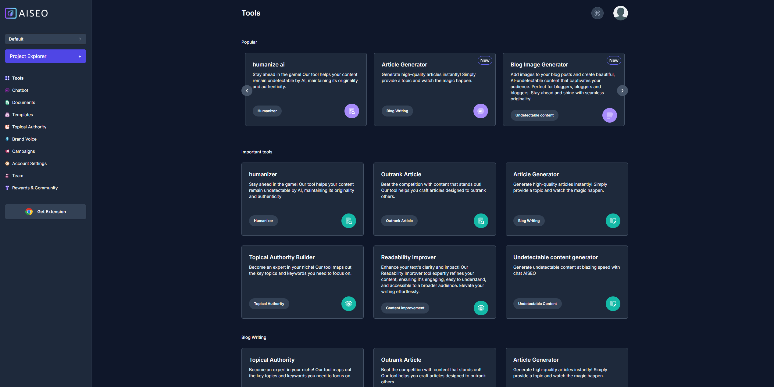 AISEO presents a large suite of writing and SEO tools with a low starting price and includes a free plan for testing. It’s positioned for price sensitive solo creators and bloggers who need to produce simple, short form content very quickly.