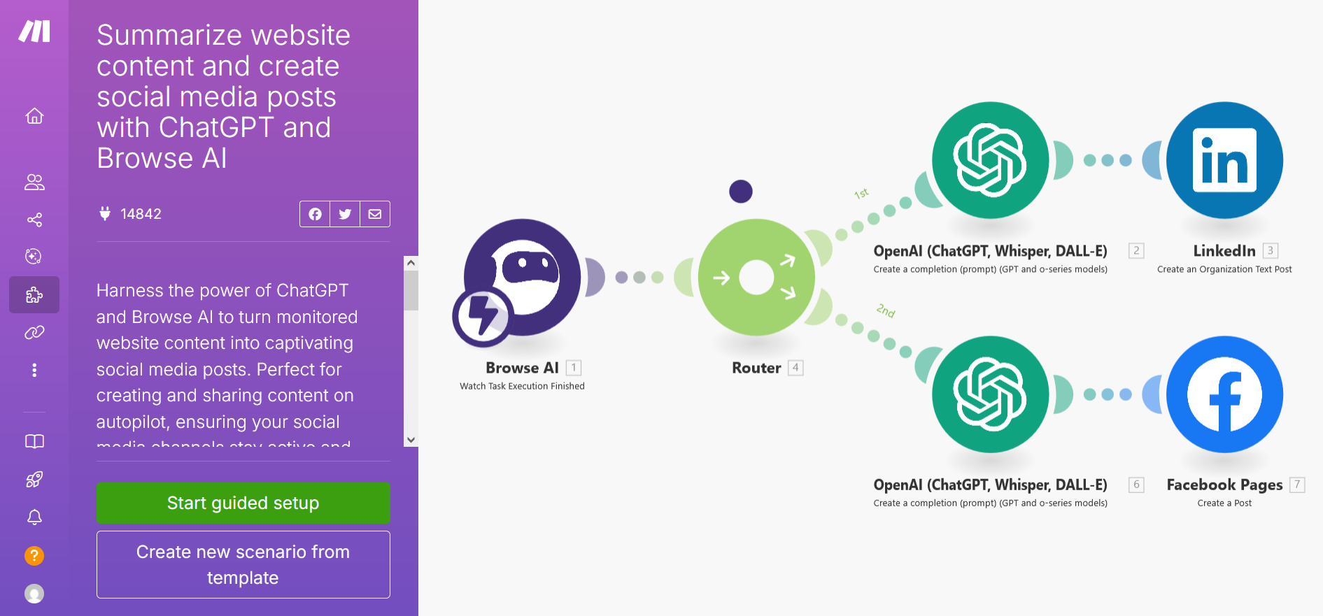 Getting started is very easy. Sign up with an email, no credit card needed, open the template library, and choose a blueprint you want to use. then click Start guided setup. The flow is the same for any template: confirm the trigger the template uses (webhook, watch task, etc.) and authenticate it, connect each app module as you’re prompted; map fields in the mappers (what goes into the prompt, what posts to each destination) and run a test. If the test looks right, add any quick filters/error handlers, choose Schedule or keep it webhook triggered, rename the scenario, and turn it on.